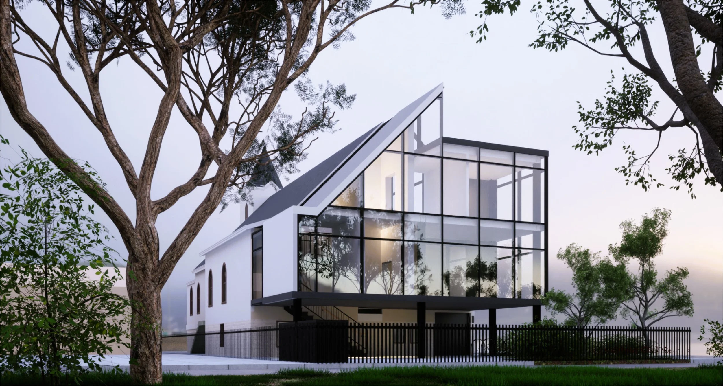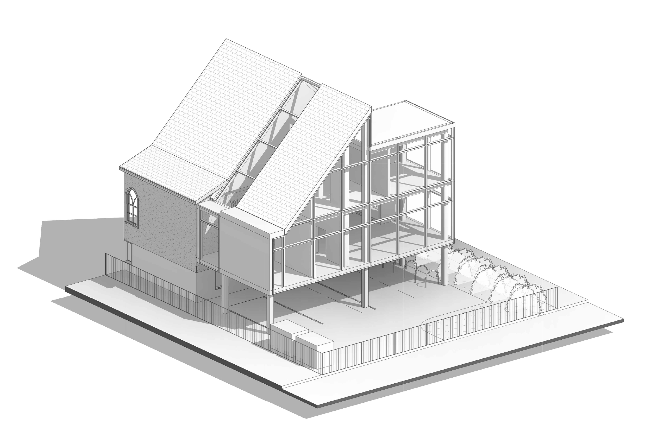 The design features a clear juxtaposition of styles and volumes, creating a modern form that stands out while maintaining a dialogue with the historic structure.